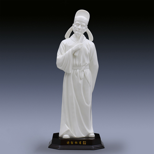《詩圣杜甫》作品以德化高白瓷土為原料,結(jié)合中國龍瓷工藝美術(shù)大師的創(chuàng)意匠心,運(yùn)用傳統(tǒng)瓷雕的捏、塑、雕、刻、刮、削、接、貼等技法,歷經(jīng)高溫?zé),精制而成。釉面溫潤光潔,瓷質(zhì)精美,再現(xiàn)了傳統(tǒng)德化白瓷雕塑的神奇韻味。雕像人物,形象生動(dòng)逼真。右手持書卷,左手微微后擺,低眉蹙目,若愁思狀;衣衫臨風(fēng)飄舉,流暢自如,形象塑造了杜甫心系蒼生,胸懷國事,憂國憂民的博大胸襟。作品歷史文化與傳統(tǒng)雕塑工藝完美結(jié)合,具有豐厚的文化積淀。