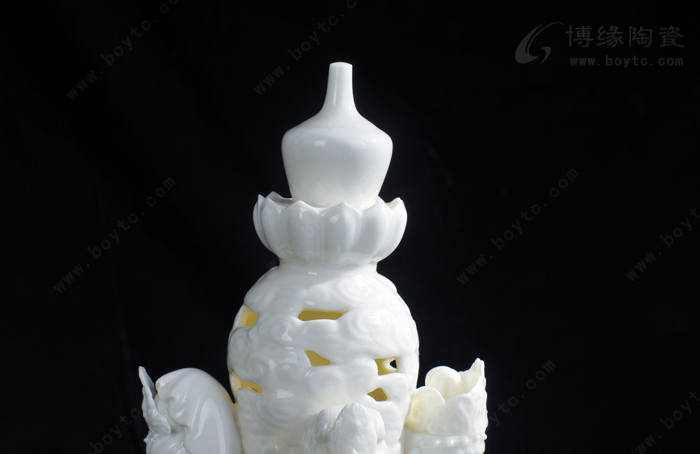 例二:“玉白釉瓷”:以前“德化白”、“中國白”完全靠瓷土好發(fā)色,最近新研發(fā)的“玉白釉”的發(fā)明,改變了長期以來中國白的傳統(tǒng)概念,以創(chuàng)新方式來表達(dá)一樣中國白,和傳統(tǒng)的“中國白”相比,用“玉白釉”就可以不用很好的瓷土也能表達(dá)的非常溫潤如玉、釉色肥厚、耐與琢磨的感覺,有著典型的“豬油白“、“建白”、“象牙白”特征,跟高端的“中國白”很好的瓷土相比,不僅節(jié)省了很多成本,也創(chuàng)造了一種新的陶瓷藝術(shù)美。