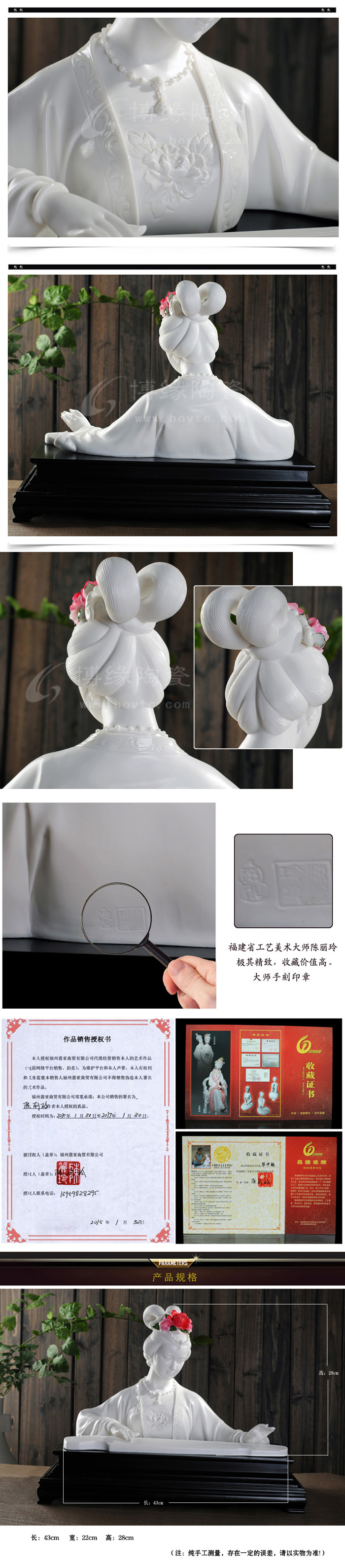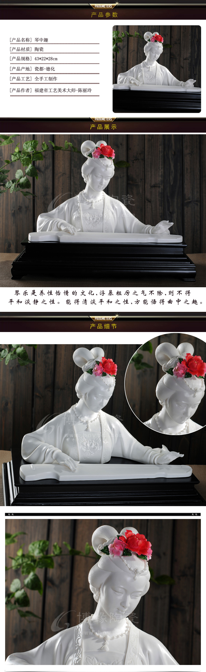 陳麗玲,女,1975年出生于福建德化瓷雕世家。德化縣第九屆政協(xié)委員,福建省工藝美術(shù)學(xué)會會員,中國工藝美術(shù)學(xué)會會員,陶瓷雕塑(國家一級)高級技師,高級工藝美術(shù)師,福建省青年民間工藝大師, 福建省陶瓷藝術(shù)大師,福建省工藝美術(shù)大師,昌德瓷塑的第三代傳人。