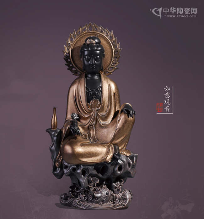 “在德化一般人眼里,佛像都是白瓷和彩瓷來(lái)表現(xiàn)的,我做的佛像卻大都是用高端釉藝來(lái)表現(xiàn)。”鄭國(guó)明說(shuō),做佛像時(shí),他巧妙地運(yùn)用型與色結(jié)合裝飾,衣服的顏色用 “古亞金釉”,膚色用陶的本色或用亞光彩虹黑釉來(lái)體現(xiàn),底座再用鐵銹釉來(lái)表現(xiàn),裝飾效果顯得華而不艷,莊重古樸,端莊凝重中滲透出無(wú)限的智慧和慈悲的情懷。