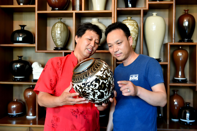 馬會昌與到訪的陽泉市收藏家協(xié)會盂縣分會會長高飛研究定窯瓷器