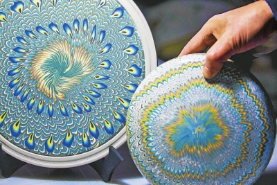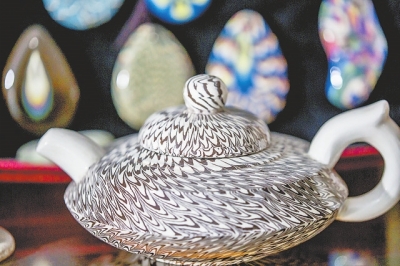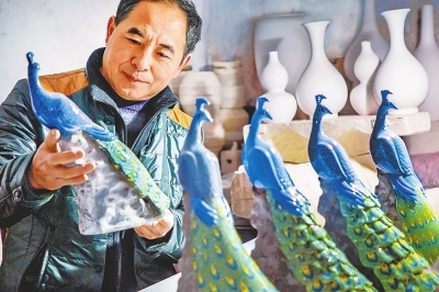 11月23日,焦作市國(guó)寶絞胎瓷藝術(shù)工作室,一只只孔雀蓄力欲飛。絞胎瓷,因其花紋表里如一、不可復(fù)制而被譽(yù)為陶瓷中的“珍奇”;膠釉瓷,因其紋花紋飾色彩艷麗動(dòng)人而被贊譽(yù)為陶瓷中的“奇葩”。膠釉瓷制作技藝傳承人董國(guó)保把膠釉瓷的造型、花紋、紋理融于絞胎瓷的生產(chǎn)工藝中,創(chuàng)作出了100多個(gè)品種的作品,產(chǎn)品遠(yuǎn)銷(xiāo)歐美等國(guó)家和地區(qū)。