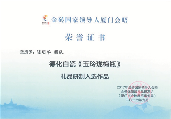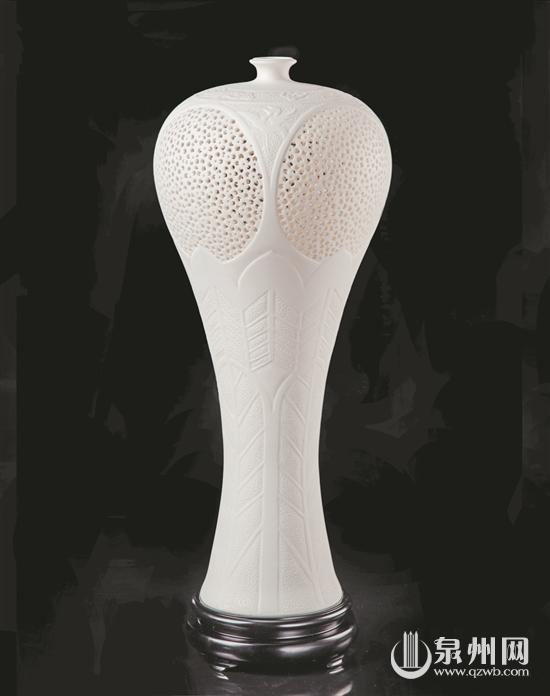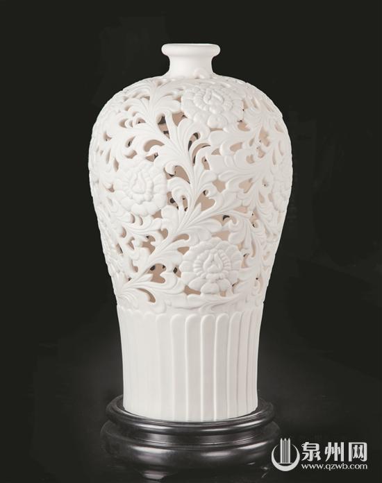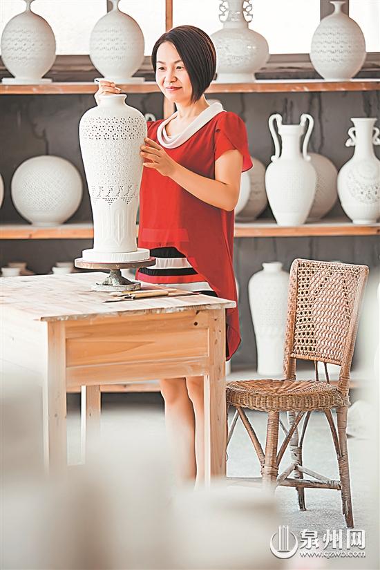 1988年,20來歲的陳明華創(chuàng)作了《菊花通花瓶》《雙魚通花瓶》,獲得福建省陶瓷新品大師一、二等獎。這讓熱愛創(chuàng)作的陳明華更自信,多年來潛心研究開發(fā)通花、鏤雕藝術(shù),作品多次在國家級、省級大賽中摘金奪銀,深受國內(nèi)外友人的青睞。她的作品《雙龍爭艷》通花瓶分別被福建省博物館、中國陶瓷博物館(原景德鎮(zhèn)陶瓷館)、福建省工藝美術(shù)珍品館等收藏,《世博梅瓶》被中國閩臺緣博物館收藏,《通花梅瓶》分別被中國閩臺緣博物館、中華民族藝術(shù)珍品館收藏。