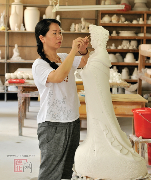 曾素妹,福建省陶瓷大師、福建省雕刻藝術(shù)大師,現(xiàn)為金鳳祥工藝有限公司藝術(shù)總監(jiān)。她被稱作德化瓷藝界的“瓷中鳳凰”,憑著聰穎的悟性在陶瓷天地中,潛心創(chuàng)作出一件件杰出作品,開創(chuàng)出一片廣闊天地,如金鳳一般展翅飛翔。