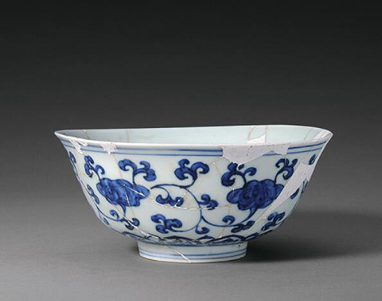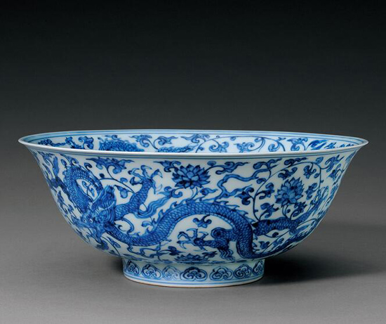 此碗沿用明代前期龍穿纏枝蓮紋碗的造型和紋飾,雙鉤紋飾線條流暢,填色細(xì)致,青花發(fā)色純正,局部出現(xiàn)鐵銹斑,體現(xiàn)出正德朝御用青花瓷器造型穩(wěn)重、紋飾精美的風(fēng)貌。