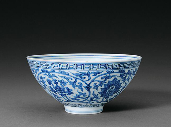 碗撇口、深弧壁、瘦底、圈足。內(nèi)、外青花裝飾。內(nèi)底畫青花雙圈,外壁近口沿處繪回紋邊飾,腹部繪纏枝花紋,近足處繪變形如意頭紋。圈足內(nèi)施白釉。外底署青花楷體“正德年制”四字雙行外圍雙圈款。