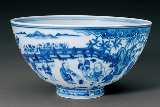 碗撇口、深弧壁、瘦底、圈足。內(nèi)壁近口沿處畫青花弦線兩道。外壁繪青花庭院嬰戲圖,兒童有的逮蝴蝶、有的浴佛、有的以荷葉竹馬扮成官人模樣,空間襯以山石、松竹、柳樹(shù)、圍欄等,場(chǎng)面顯得非常熱鬧。
