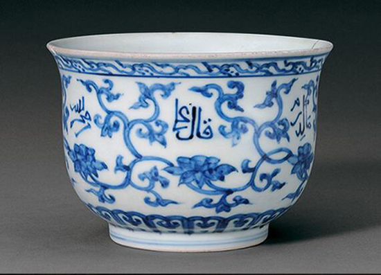 以阿拉伯文作為瓷器裝飾以明代正德朝御窯瓷器上最為多見(jiàn),除纏枝蓮?fù)邪⒗耐,另?jiàn)有在圓形或菱形開(kāi)光內(nèi)書寫阿拉伯文者,文字內(nèi)容多位《古蘭經(jīng)》里的語(yǔ)錄。