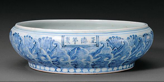 正德御窯青花瓷器造型比成化、弘治朝御窯青花瓷器豐富得多,因應(yīng)社會(huì)需求而燒造的書房、客廳用器和寺廟用供器明顯增多。所繪圖案以龍、纏枝花卉、阿拉伯文、波斯文為主。所署年款既有青花楷體 “大明正德年制”六字款,也有“正德年制”四字款和“大明宣德年制”仿款,更有稀見(jiàn)的八思巴文款。