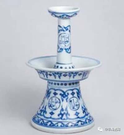 這是一件明正德年間的青花燭臺(tái)。燭臺(tái)很復(fù)雜,由四部分組成,最上端為蠟燭插口,外壁繪如意云頭紋;其下為燭臺(tái)細(xì)長(zhǎng)支柱,中部繪圓形開(kāi)光,開(kāi)光內(nèi)書(shū)寫(xiě)阿拉伯文,上下分別繪勾蓮花枝紋及菱形紋。再下為承托圓盤(pán),也繪如意云頭紋;最下端為喇叭形臺(tái)座,也繪圓形開(kāi)光,開(kāi)光內(nèi)書(shū)寫(xiě)阿拉伯文,開(kāi)光上下分別繪勾蓮花枝紋及菱形紋。燭臺(tái)上的阿拉伯文與傳統(tǒng)紋飾,表現(xiàn)出阿拉伯文化與中華傳統(tǒng)文化的交融。
