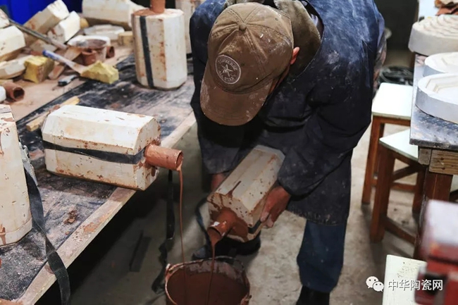 時至今日,在開封城內(nèi),有多家官瓷傳承機構(gòu),于樂土從研發(fā)能力到動手制作,技藝全面,正是其中的佼佼者,他為我們演示了官瓷制作的基本過程。圖為注漿一定時間后,將模具內(nèi)未凝結(jié)的陶漿倒出,倒出的時機決定著瓷器的厚薄和均勻程度,全憑借匠人積累的經(jīng)驗。