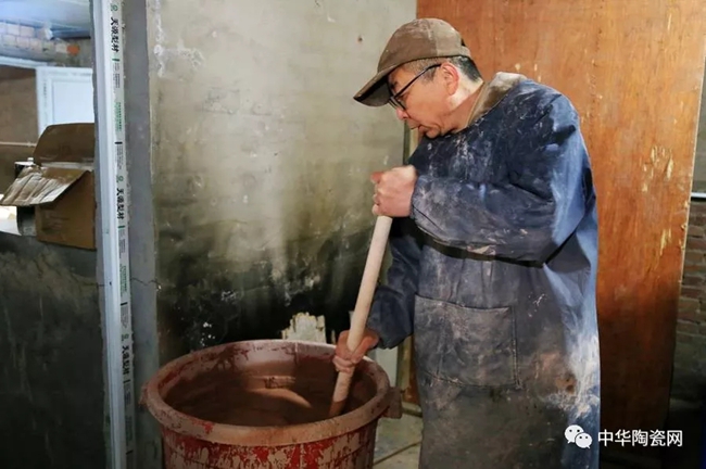 如同平凡的泥土變成珍貴的藝術(shù)品前并不能被人一眼看穿其價值。眼前的于樂土實際上曾歷任開封北宋官瓷研究所的技術(shù)員、研究員、技術(shù)副所長等職,從業(yè)近30年,作為當(dāng)代北宋官瓷行業(yè)一個深具代表性的人物,他不僅制作出不少官瓷精品,為北宋官瓷贏得了許多榮譽,還首次讓當(dāng)代官瓷作品選入了國家義務(wù)教育教科書。圖為制作陶漿