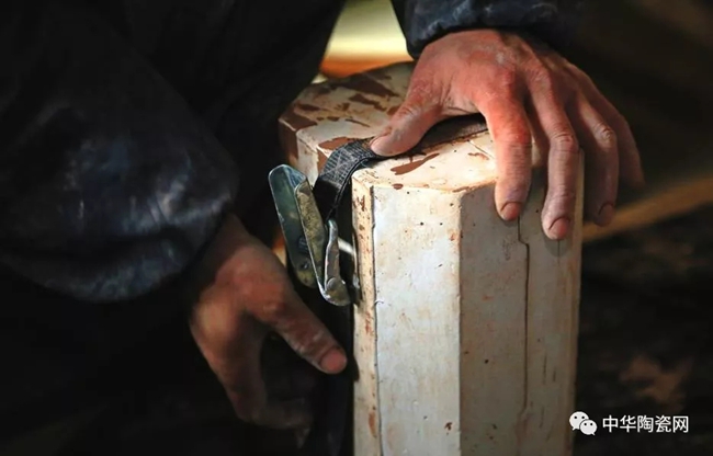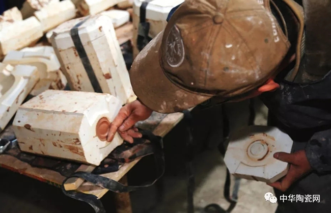 于樂土說,官瓷作品當(dāng)時作為國儀之用的禮器,依據(jù)三代青銅器和玉器造型,有四個“非常”——第一個非常,皇家壟斷,成就高,收藏范圍小;第二個非常,誕生時機不巧,趕上金人入侵,燒造不足20年,存世量小;第三個非常,器形合乎法度,禮器全有出處,不能用不可控的手工拉坯,必須精制模具;第四個非常,風(fēng)格厚重,工藝復(fù)雜,需要多遍施釉。圖為脫模