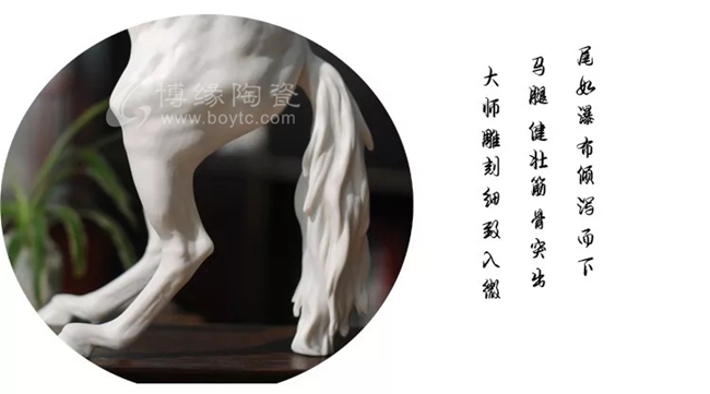 白瓷駿馬,馬的蹄、鬃毛、眼神、耳朵、乃至馬尾,馬的塊狀肌肉與健壯的骨架,都是大師親手雕刻,可以感受到大師用心的處理每一處細(xì)節(jié)。