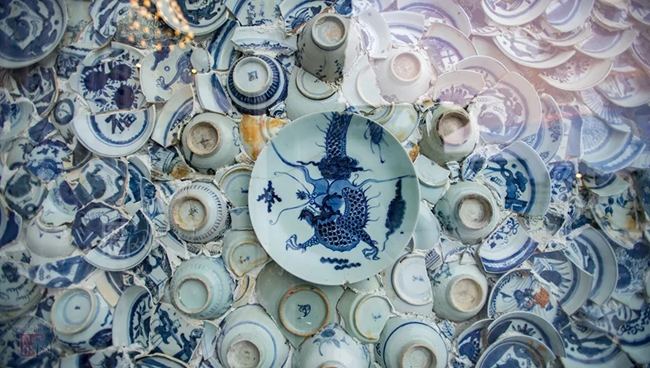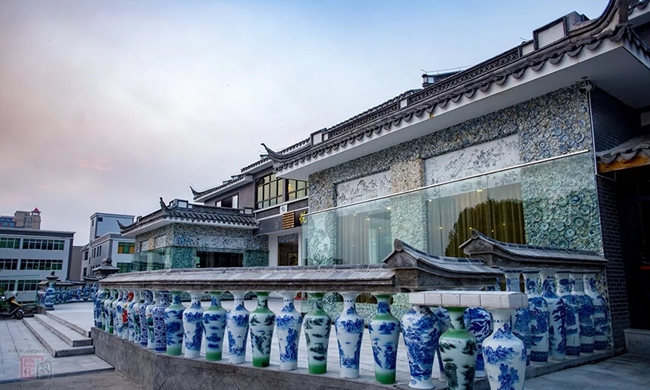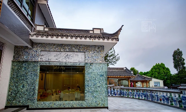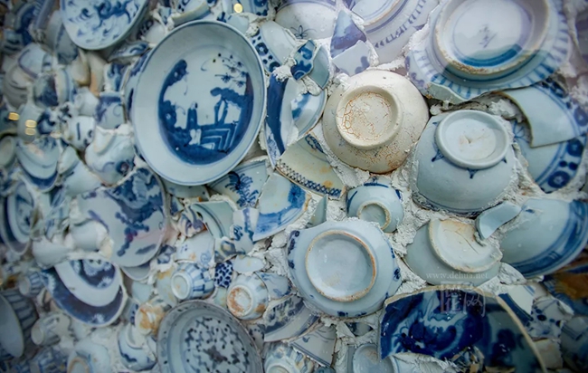“千窯萬(wàn)瓷墻”一共使用了10萬(wàn)多塊古瓷片,以及部分保存完整的清代青花瓷盤(pán),如位于左右兩側(cè)的龍紋盤(pán)與鳳紋盤(pán)等。這些瓷片與瓷盤(pán)均由德化大興堡鄭氏家族歷代傳承而來(lái)。盡管整個(gè)墻體看不到明顯的圖案,卻能在錯(cuò)落的瓷片之中感受到青花瓷的美感,故有“縱有珠寶一箱,不如瓷瓦一方”的說(shuō)法。