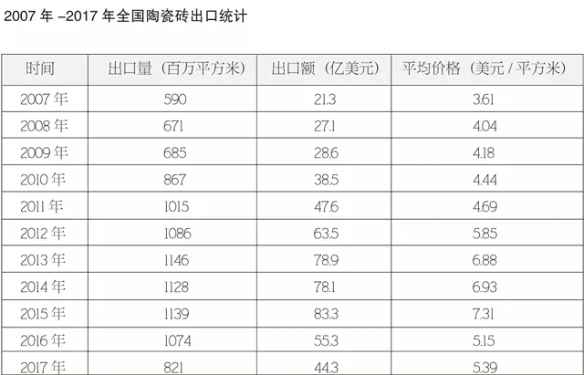 在三十余年的發(fā)展歷程中,2015年以前,中國(guó)陶瓷磚的出口量與出口額基本呈穩(wěn)步增長(zhǎng)的態(tài)勢(shì)。據(jù)日前中國(guó)建筑衛(wèi)生陶瓷協(xié)會(huì)常務(wù)副會(huì)長(zhǎng)繆斌發(fā)布的數(shù)據(jù)顯示,僅2007~2015年這九年間,中國(guó)陶瓷磚的出口量從5.9億平方米增長(zhǎng)至11.39億平方米,將近翻了一番;出口額從21.3億美元上升至83.3億美元;平均價(jià)格由3.61美元/平方米上調(diào)至7.31美元/平方米。