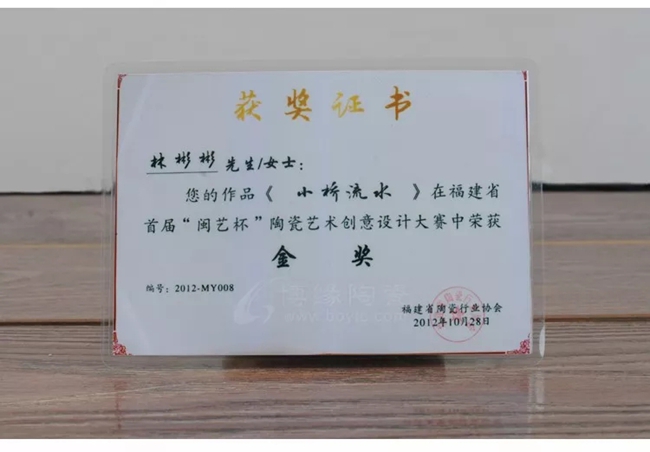 作品還榮獲福建省首屆“閩藝杯”陶瓷藝術(shù)創(chuàng)意設計大賽金獎。