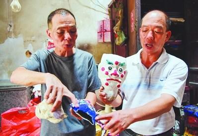 前場陳氏傳統(tǒng)糊紙技藝傳承人陳賜勇、陳賜堅展示紙質(zhì)人偶面具。
