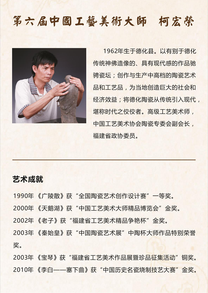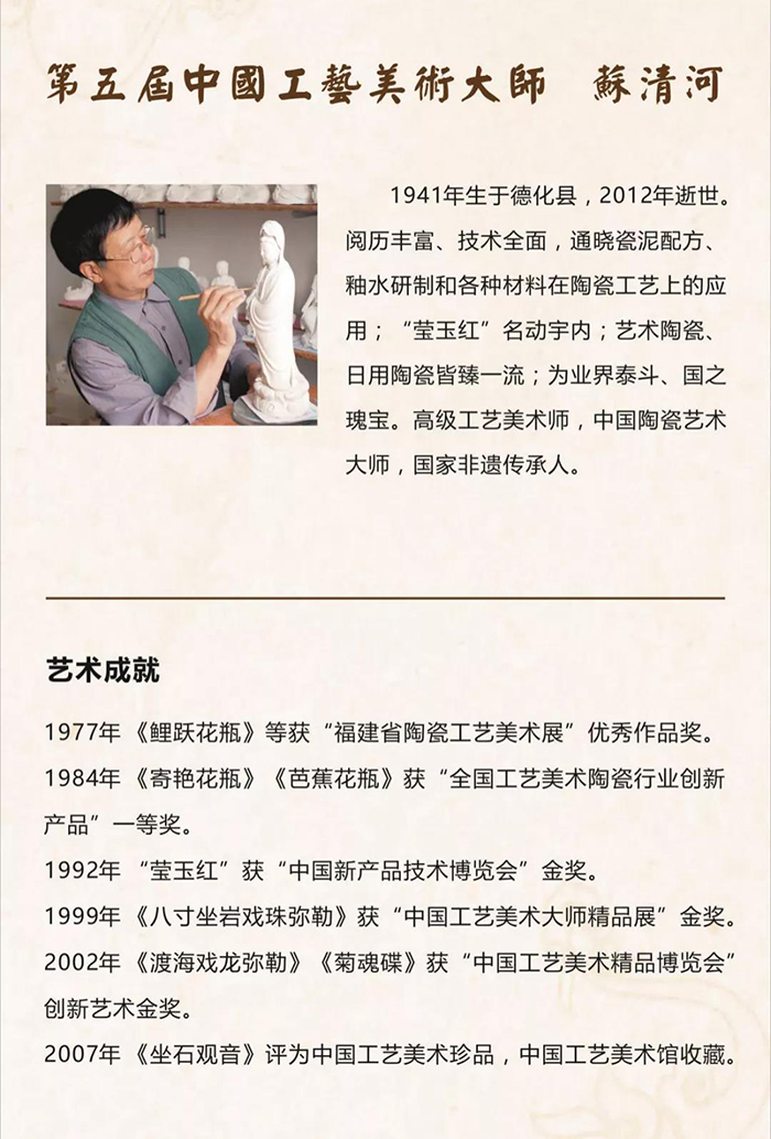 2020年,《八閩中國工藝美術(shù)大師全集》在原《八閩瑰寶——八閩中國工藝美術(shù)大師合集》基礎(chǔ)上,潤色補(bǔ)充,收錄福建省全部49位國大師資料,其中德化獲評中國工藝美術(shù)大師有6人,他們憑借著對工藝陶瓷精益求精的追求與堅(jiān)守,成為引領(lǐng)一方的代表性人物。