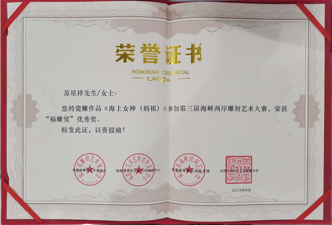 2016年《海上女神(媽祖)》獲第三屆海峽兩岸雕刻藝術(shù)大賽“福雕獎”。