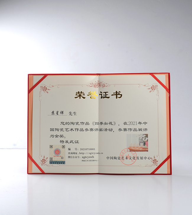 2021年作品《四季如花》獲榮2021年北京中國陶瓷藝術(shù)名家作品展金獎。