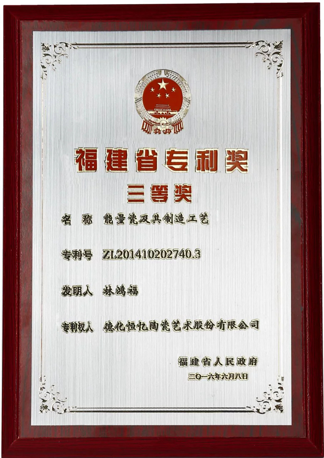日前,德化恒憶陶瓷藝術(shù)股份有限公司(簡稱“德化恒憶”)收到福建省人民政府頒發(fā)的《福建省專利獎證書》和《福建省專利獎牌匾》。德化恒憶自主研發(fā)的發(fā)明專利:“能量瓷及其制造工藝”(專利號:ZL201410202740.3)榮獲福建省專利獎三等獎,本發(fā)明專利能釋放對人體有益的負離子及紅外線穿透性微電波,無鉛、鎘等重金屬含量,具有抗菌、易潔、活水等功能。