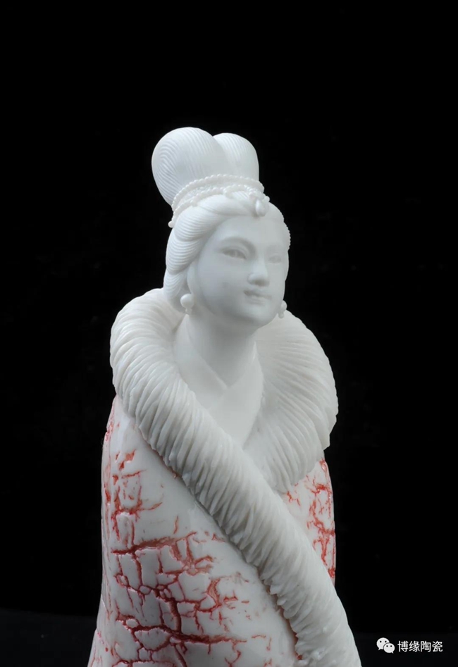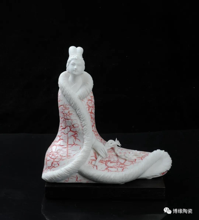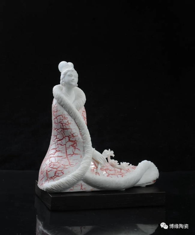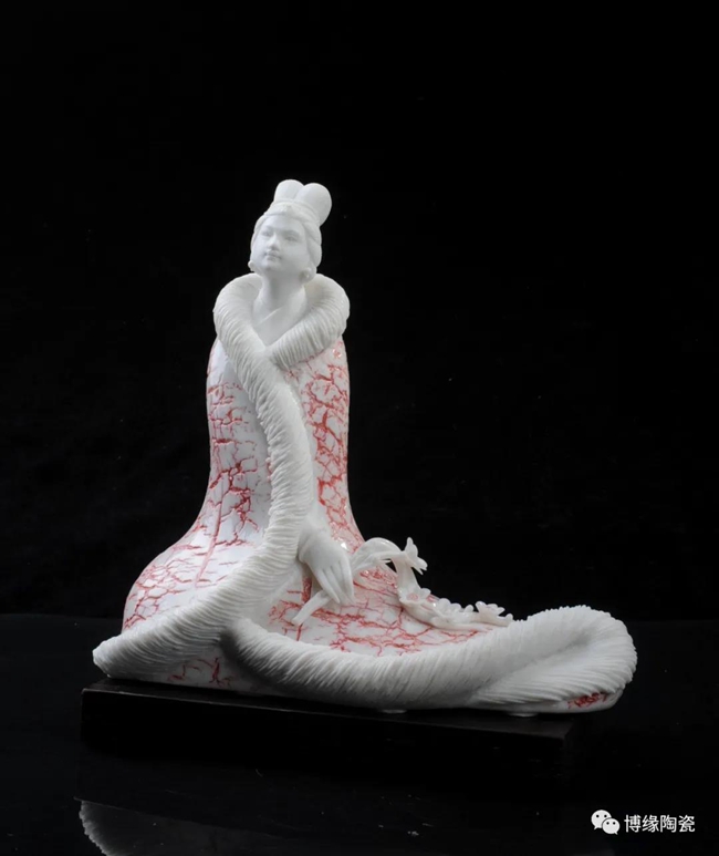 《詠梅》是當(dāng)代著名陶瓷大師,中國工藝美術(shù)大師——柯宏榮、陳桂玉夫婦創(chuàng)作的作品。作品以德化白瓷為胎質(zhì),以寫意雕塑手法,見女子身披粉色雪狐棉衣,坐于茫茫雪花之中,一手持梅花,頭微微上仰,仿佛沉醉于梅花花海之中,作品頭飾、衣飾、發(fā)絲、梅花純手工雕刻,所到之處無不精細贊嘆,足見大師在創(chuàng)作時的獨運匠心,作品底部有中國工藝美術(shù)大師柯宏榮、陳桂玉夫婦手刻簽名,是一件不可多得的收藏精品。