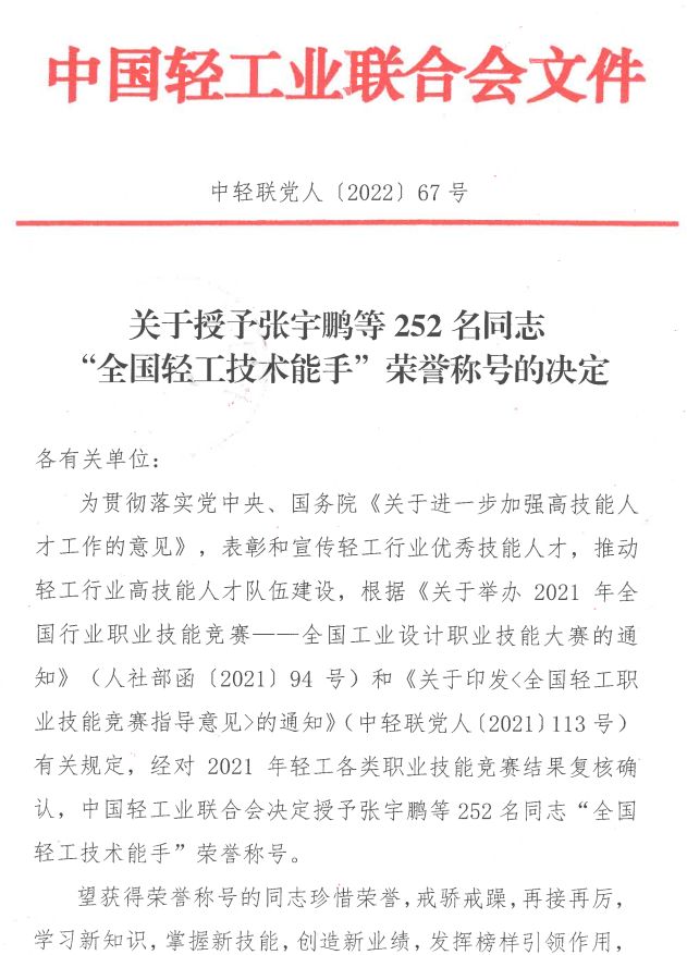 “全國(guó)輕工技術(shù)能手”榮譽(yù)光榮榜