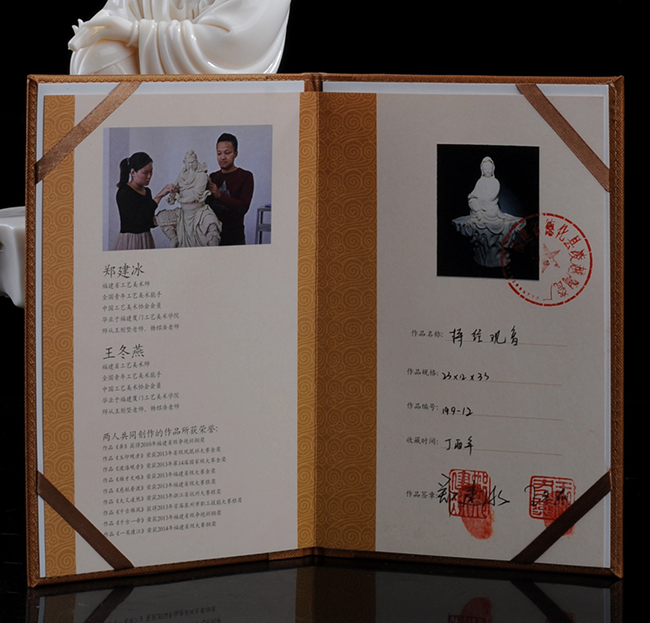 《持經(jīng)觀音》由福建省陶瓷藝術(shù)大師鄭建冰設(shè)計創(chuàng)作。作品以德化溫潤如玉的 “中國白”為胎質(zhì),經(jīng)1300多度高溫?zé)疲ンw溫潤如玉。作品觀音面容飽滿,神情刻畫,逼真自然,匠心造像,手持經(jīng)書,衣紋線條柔美,流暢自然,形象塑造,生動自然,精雕細刻,栩栩如生。觀音慈悲之相,宛然可見。作品落有大師個人簽名及印章落款,兼具審美價值和收藏價值,是不可多得的雅作。是辦公、家居、書房裝飾擺設(shè)、禮贈、收藏的好選擇。