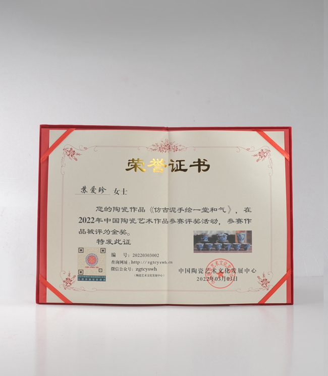 作品《仿古泥手繪一堂和氣》榮獲2022年中國(guó)陶瓷藝術(shù)作品評(píng)比金獎(jiǎng)