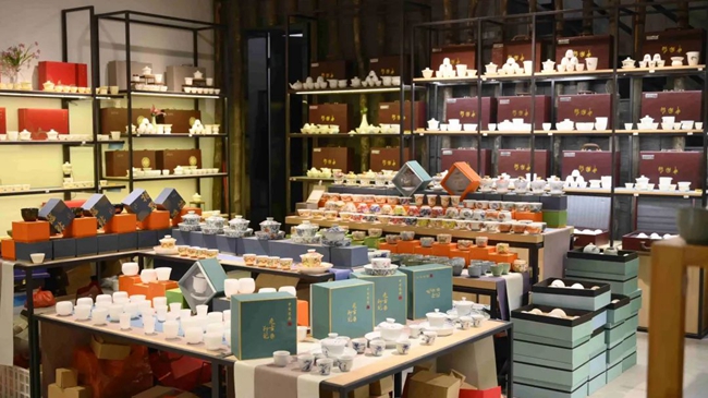 走進(jìn)中國(guó)茶具城,街道兩側(cè)排布著大大小小的茶具及配套產(chǎn)品企業(yè)展廳。走入一家,便可看到展架上琳瑯滿目的特色茶具,有配以四季花卉圖案的季節(jié)主題茶盞,有溫潤(rùn)透亮、做工精美的白瓷茶杯,還有適用于贈(zèng)人、自用不同場(chǎng)景的套裝茶具。