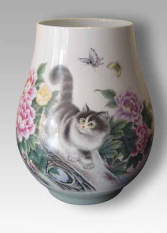 粉彩貓蝶伏桶手繪瓶