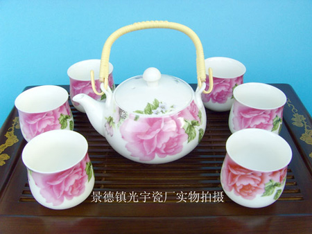 純手工繪制的釉中彩圖案栩栩如生,清新淡雅.配有錦盒包裝,自用送禮兩相宜. "茶"是回歸清凈的良方。一份茶香、一份閑情,三五好友、或個人獨處,泡茶品茗、隨意又自在。 要泡一壸香醇甘味的好茶,最重要的就是沖泡過程和杯壸。好的茶器具組合搭配最愛的茗茶,可使身心同時獲得解放。也是人生一大享受 。陶作坊作品皆符合人體工學(xué),是兼具藝術(shù)及實用價值的現(xiàn)代品茗器具! 景德鎮(zhèn)市光宇陶瓷廠位于“中國瓷都”――景德鎮(zhèn)。其產(chǎn)品經(jīng)江西省景德鎮(zhèn)市光宇陶瓷研究所工程師精心研究設(shè)計,精選上乘高嶺瓷土,做工精細(xì),經(jīng)高溫?zé)珊蟠少|(zhì)細(xì)膩、如脂如玉、晶瑩剔透、高貴典雅,手感、口感、眼觀與眾不同,釉面溫潤柔和、色澤高貴典雅。瓷質(zhì)剛堅強韌、晶瑩剔透,具有良好的熱穩(wěn)定性,耐高溫,抗沖擊強度高,并經(jīng)中國檢驗認(rèn)證集團(tuán)江西有限公司檢驗,其含鉛、鉻、鎘低于國際標(biāo)準(zhǔn)。是現(xiàn)代家庭、高級酒店、機關(guān)單位、企業(yè)家首選日用陶瓷的佳品。是星級賓館、高級餐廳首選用瓷,深受海內(nèi)外客商的青睞。