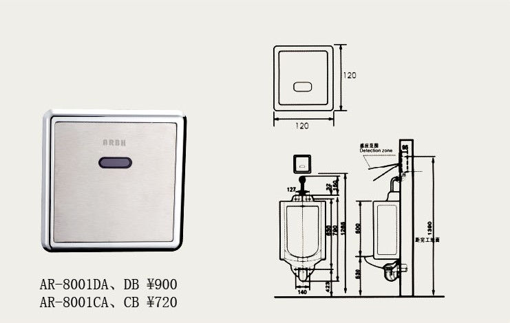 產(chǎn)品參數(shù)表: 電源:DC6V(4節(jié)5號(hào)堿性電池) 靜耗:≤0.5W(DC) 沖水時(shí)間:感應(yīng)后沖水2秒,離開(kāi)時(shí)再?zèng)_4秒 感應(yīng)范圍:自動(dòng)測(cè)距 進(jìn)出水管徑:G(1/2)″(DN15) 感應(yīng)確認(rèn)時(shí)間:2秒(不足2秒不啟動(dòng)) 適用環(huán)境溫度:1-55℃ 流量:≥0.12(L/S) 防護(hù)等級(jí):IP56 功能特性: 1、紅外感應(yīng)、自動(dòng)關(guān)水出水、節(jié)水、方便、衛(wèi)生、可有效避免細(xì)菌交叉感染。 2、主機(jī)采用微電腦控制,可根據(jù)使用的頻率及每次使用的時(shí)間長(zhǎng)短自動(dòng)調(diào)節(jié)沖水時(shí)間,更有效節(jié)水。 3、機(jī)器在使用頻率高的場(chǎng)所平均每次的沖水量為1.2-3L,在使用頻率低的場(chǎng)所每次沖水量為2-4L(注水壓為0.3-0.6Mpa)。 4、內(nèi)設(shè)水量調(diào)節(jié)閥及過(guò)濾網(wǎng),非專業(yè)人員可以進(jìn)行水量調(diào)節(jié)及過(guò)濾網(wǎng)清洗。 5、當(dāng)便器長(zhǎng)期處于不使用狀態(tài),沖水器將24小時(shí)自動(dòng)沖水一次,以防存水彎中存水干涸,導(dǎo)致臭氣回竄。 6、藏墻體式設(shè)計(jì),體現(xiàn)裝飾與環(huán)境一體化。 7、機(jī)器可選擇交、直流兩種供電方式。 |