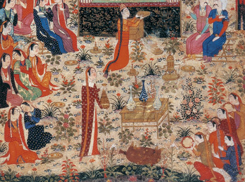庭院筵席局部。1396年制品,倫敦大英圖書(shū)館藏。圖中木桌上擺設(shè)著作為容器使用的玉壺春瓶