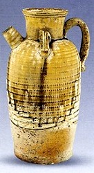 黃釉執(zhí)壺 唐 高20·5厘米 直頸,筒狀直腹,短流,上飾有4道弦紋,前后飾U字形系,器身施黃釉,滾印席紋。 |