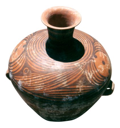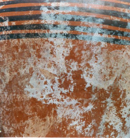 彩陶上草根紋多見,這是因?yàn)椴侍张c各種植物莖根常年在地下共存,年復(fù)一年,草根生長(zhǎng)的痕跡在彩陶表面留下紋理,并且浸透很深,有壓印上去的感覺。有的草根紋已深入胎內(nèi),對(duì)彩陶的色彩、胎質(zhì)有所破壞。