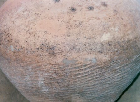 地下潮濕形成的泥漿、土類、沙粒含堿物質(zhì)合成后浸蝕到彩陶上面,致使彩陶局部表層出現(xiàn)顆粒狀皮殼。由于形成時(shí)間較長(zhǎng),浸蝕較深,清洗很難,用酸加水反復(fù)清除方見底胎和色彩。如不得法會(huì)損壞外部繪制的顏色和紋飾。