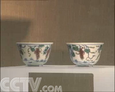 這對(duì)小杯子與成化斗彩雞缸杯和三秋杯的圖案有所不同,因?yàn)槠淅L有葡萄圖案,而被稱為成化斗彩葡萄杯。在首都博物館的瓷器展廳里,它們的位置并不顯著,但是一聯(lián)想到1999年,在香港蘇富比拍賣會(huì)上,拍出了2917萬(wàn)港幣的高價(jià)那件成化斗彩雞缸杯,還有故宮博物院珍藏的那世上唯一一對(duì)成化斗彩三秋杯,我們就自然能夠感覺(jué)到眼前的這對(duì)小杯子的價(jià)值了。