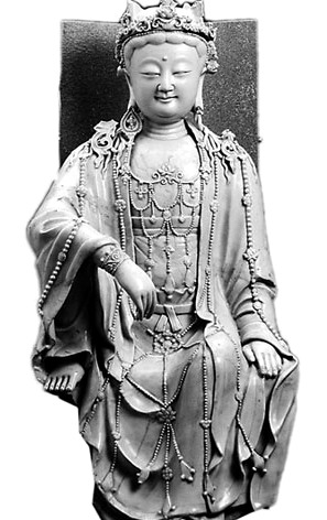 在首都博物館“古代瓷器藝術(shù)精品展”的元代展廳內(nèi),有一件觀音菩薩像特別引人注目,它就是元代景德鎮(zhèn)窯青白釉水月觀音菩薩像——首都博物館的鎮(zhèn)館之寶。