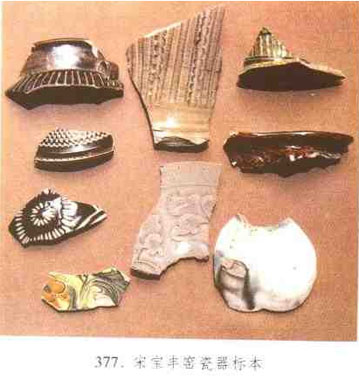 宋、金時(shí)期瓷窯,在寶豐清涼寺。燒瓷品種有青釉、白釉、黑釉、綠釉、醬釉、三彩、鈞釉等。青瓷質(zhì)量較好,造型、紋飾與耀州窯近似,青釉印花碗較多、紋飾主要有纏校菊紋、菊瓣紋、海水魚(yú)紋、海水螺紋、蓮紋、分格折枝花紋等,還有其他窯所未見(jiàn)的海水船紋。刻花裝飾見(jiàn)于盤、瓶、器蓋、碗上,有刻線紋、刻菊瓣紋。劃花裝飾有花卉、劃花間篦劃紋。青釉光素器物中的厚唇小足小碗,與耀州、臨汝窯青釉小碗很相似。還有的碗內(nèi)飾5至6條線紋裝飾,這類碗在耀州、臨汝等窯也很常見(jiàn)。此外光素器物還有器蓋、雙耳罐等。白釉器物有黑口碗、雙耳罐、瓜棱罐、珍珠地劃花瓶、篦劃水波紋瓶、柳斗杯。黑釉器物有線紋罐,醬色花紋器物有瓶、雙系瓶、罐、六角紋盤(有的里心有褐色點(diǎn)彩)等。黑釉戳麥粒紋裝飾在北方其他窯中比較少見(jiàn)。醬釉碗有的為外醬釉、內(nèi)醬口白釉。綠釉器有水波紋、篦點(diǎn)紋枕、梅花式盒、爐。三彩器有腰圓、八方枕、此外還有赭黃色劃花腰圓忱。鈞釉標(biāo)本較少,主要器形為碗。(見(jiàn)圖377)