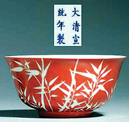 圖片說明:清宣統(tǒng)·礬紅留白竹紋碗