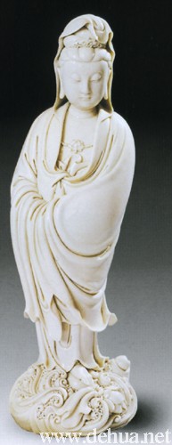 釉色白中泛黃,呈牙白色,如凝脂凍玉,滋潤(rùn)瑩滑。觀音雙手藏袖,露一足踏蓮花,另一足水花掩蓋,作踏浪凌波渡海之勢(shì)。觀音神情嫻雅平靜,安詳自若,雙目低垂凝思。整座塑像精巧細(xì)致,神態(tài)如生,背鈐有“何朝宗印”方形印章款。