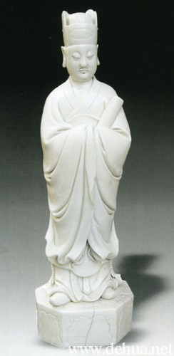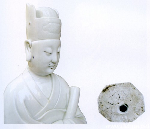釉色白中閃黃,呈象牙色,溫潤(rùn)細(xì)膩。文官頭戴官帽,丹鳳眼,鬢須以真毛填補(bǔ),雙手合攏于衣袖內(nèi),作執(zhí)笏板狀,神態(tài)閑然自若,立于臺(tái)上,精雕細(xì)刻,線條圓潤(rùn)、流暢、洗練。底部?jī)H留一小洞,系以整塊瓷泥捏塑而成,胎體渾厚,有窯裂。