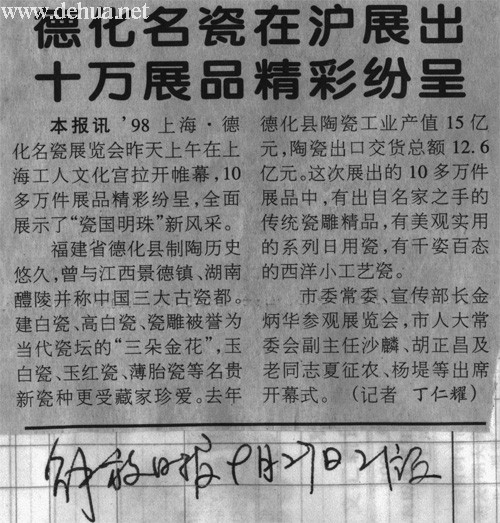 本報(bào)訊’98上海·德化名瓷展覽會(huì)昨天上午在上海工人文化宮拉開(kāi)帷幕,10多萬(wàn)件展品精彩紛呈,全面展示了“瓷國(guó)明珠”新風(fēng)采。