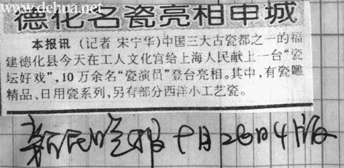 本報(bào)訊(記者宋寧華)中國三大古瓷都之一的福建德化縣今天在工人文化宮給上海人獻(xiàn)上一臺(tái)“瓷壇好戲”,10萬余名“瓷演員”登臺(tái)亮相。其中,有瓷雕精品、日用瓷系列,另有部分西尖小工藝瓷。