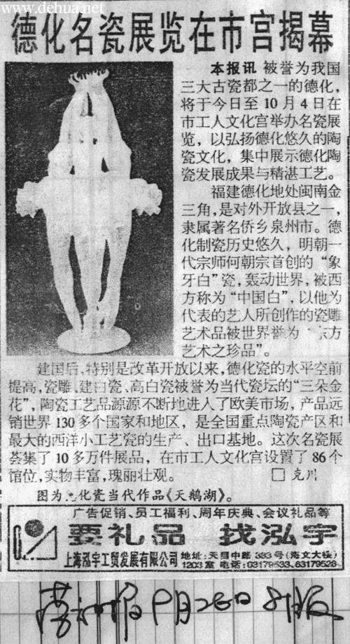 本報訊被譽為我國三大古瓷都之一的德化,將于今日至lO月4日在市工人文化宮舉辦名瓷展覽,以弘揚德化悠久的陶瓷文化,集中展示德化陶瓷發(fā)展成果與精湛工藝。