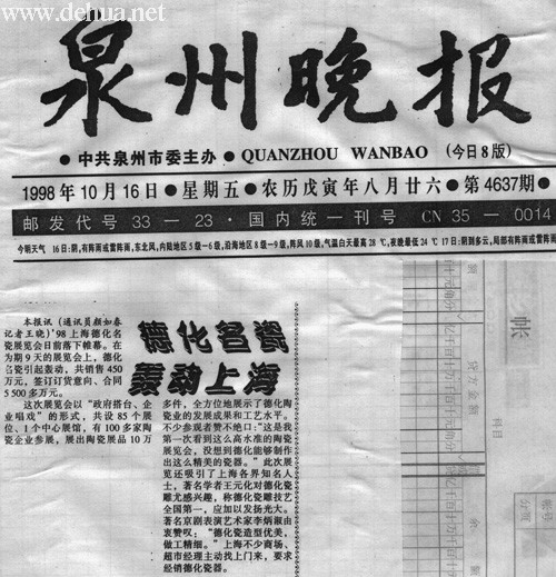 本報(bào)訊(通訊員顏如春記者王曉)’98上海德化名瓷展覽會(huì)日前落下帷幕。在為期9天的展覽會(huì)上,德化名瓷引起轟動(dòng),共銷售450萬元,簽訂訂貨意向、合同5500多萬元。