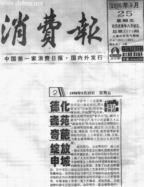政府搭臺(tái)、企業(yè)唱戲的’98上海·德化名瓷展覽會(huì)讓德化瓷苑奇葩有緣在申城綻敬,本月26日到l0月4日在上海工人文化宮86個(gè)館位舉辦的德化名瓷展覽會(huì)上將有100多家較有影響力的陶瓷企業(yè)參展,薈集了lO多萬(wàn)件展品,其中有匠心獨(dú)運(yùn)出自高級(jí)工藝美術(shù)師之手的傳統(tǒng)瓷雕精品,有傳統(tǒng)手法與現(xiàn)代藝術(shù)相結(jié)合適合國(guó)內(nèi)外市場(chǎng)的系列日用瓷和異彩紛呈的西洋款式小工藝瓷等等。參觀者除了有幸一覽工藝精湛、質(zhì)地優(yōu)良、風(fēng)格獨(dú)特的德化藝名瓷風(fēng)貌外,也許將有一款會(huì)被你選中。