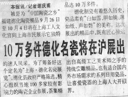 被譽(yù)為“中國(guó)陶瓷之鄉(xiāng)”福建德化陶瓷精品9月26日至10月4日將在上海工人文化宮向上海市民展示它獨(dú)特的迷人陬采。為了籌備好這個(gè)定名為“上海·德化名瓷展,覽”,德化縣政府嚴(yán)格篩選,精心組織當(dāng)?shù)?00多家較有影響力的陶瓷企業(yè)參展,薈集精品達(dá)lO萬(wàn)多件。